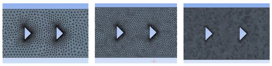 In order to numerically simulate the flow in the channel and around the bluff bodies, the flow domain was discretized by means of an unstructured grid consisting of triangular elements. To this end, the grid generation module of the academic version of FLUENT was used. The grid was made denser near the walls in order to better resolve the boundary layer regions. From the various grid metrics available in FLUENT, the parameter named after the ‘mesh size’ was mainly used to create meshes of varying density.