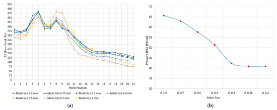 Figure 5b presents the average pressure drop in the channel as it was predicted in grids of various sizes. As it becomes evident from this plot, this quantity essentially stops changing after grid G0.3.
