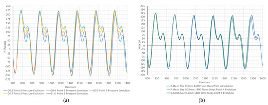Local pressure evolution at point P5 for grids (a) G1.0 to G0.3 and (b) G0.3 to G0.2.