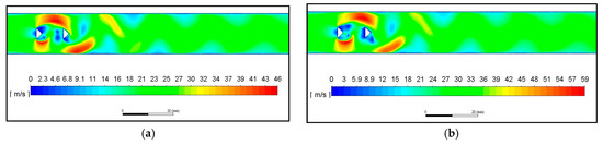 Some representative pictures of the flow field are presented first for the sake of demonstration. These refer to the baseline geometry (BR = 0.27). In particular, Figure 8a shows iso-velocity contours predicted at time 8 ms for case C4 (Vin = 20.7 m/s, Re = 6024), while Figure 8b shows corresponding results for case C7 (Vin = 26.7 m/s, Re = 7770). Obviously, due to the greater inlet velocity, greater velocities are attained in the case of C7 above and below the bluff bodies (red regions) where the flow is accelerated due to the narrow flow passage.