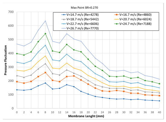 Figure 9 presents the variation of pressure amplitude along the diaphragm versus the distance from the beginning of the diaphragm (i.e., for each of the points P1–P21) for various inlet Reynolds numbers in the baseline geometry. According to this, the position of maximum pressure amplitude is found for all cases C1–C7 to be at point P5, i.e., at a distance 8 mm = 1.88 D from the beginning of the diaphragm (at 20% of the diaphragm length from its origin and at the 76% of the distance L = 10.5 mm between the two bodies). Similar plots like that of Figure 9 have been derived for all the other values of blockage ratio, and according to the corresponding results, the maximum pressure amplitude for all cases and all blockage ratios simulated herein was predicted to be at the same location, i.e., at point P5.