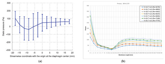 The authors in [7] state that ‘maximum pressure fluctuation is located near where the minimum mean pressure occurs’, as it is shown in their plot in Figure 10a reproduced by [7]. More specifically, it seems that the maximum pressure amplitude occurs a little downstream of the location of the minimum mean pressure. This claim motivated the present research to examine if the aforementioned statement concerning the maximum pressure amplitude and mean pressure is also valid for the set of cases simulated herein. The results of this investigation are shown in Figure 10b where the distribution of mean pressure along the diaphragm is plotted. According to this, the position of the minimum mean pressure was found for all cases C1–C7 to be at point P7, i.e., at a distance of 12 mm = 2.82 D from the beginning of the diaphragm (at 30% of the diaphragm length). This seems to validate the statement that the maximum pressure amplitude occurs near the position of the minimum mean pressure; however, herein, in contrast to the results of [7], the maximum pressure amplitude occurs a little upstream of the location of the minimum mean pressure.