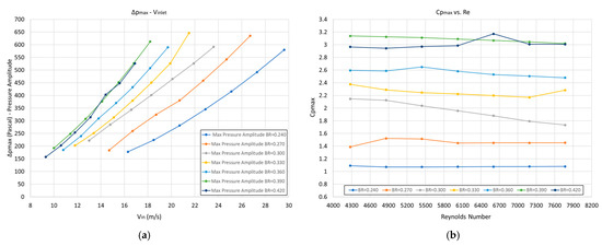 According to the results presented in Section 4.1, the non-dimensional quantities Cp,max, Strouhal number, and Cp,drop all exhibit the same behavior, i.e., are almost constant irrespective of the Re number for the same value of BR. This constant value is an increasing function of BR and could be estimated by averaging for various Res (for example, from Figure 15a,b and Figure 16 for Cp,max, the Strouhal number, and Cp,drop, respectively).