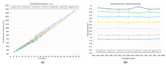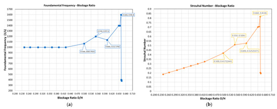 Figure 21a,b presents the corresponding plots of frequency and the Strouhal number versus BR, respectively (always referring to the pressure signal at the center S of the diaphragm). Both quantities follow the behavior described for the pressure amplitude in Figure 20; the predicted vortex shedding beyond the value of BR = 0.42 is characterized by an increase in the frequency up to BR = 0.660 where it is maximized and then exhibits a steep decrease.