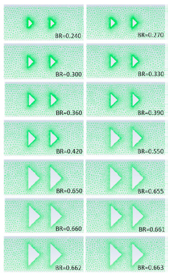To this end, a series of appropriate simulations were carried out in which the inlet velocity was kept constant Vin = 20.7 m/s, and the blockage ratio BR was gradually increased while the body aspect ratio value was also kept constant and equal to 1.95 (like in [7]). Each time, a new grid was generated, the corresponding case was simulated, and the results were post-processed up to numerically predict the suppression of vortex shedding. Figure 18 depicts a focused view of some grids used in this study in the region near the bluff bodies for various BR values. In each of these simulations, the mean value and amplitude of pressure at the diaphragm center, the average channel pressure drop, as well as the vortex shedding frequency and Strouhal number were recorded. After several numerical simulations and related trial-and-error efforts, the critical value of BR value was finally found at about BR = 0.662, i.e., significantly higher than that predicted in [3]!