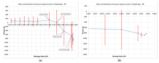 Figure 19a shows the results from the present investigation in a form similar to that of Figure 17, i.e., a change in the pressure mean value and amplitude at the center of the diaphragm versus BR. According to this figure, pressure amplitude increases with the increase in BR, attaining a maximum of BR = 0.655. Then, an abrupt decrease occurs and suddenly becomes 0 for BR = 0.662, i.e., in a very small region of BR increase. This behavior of attaining a maximum and then decreasing to zero is qualitatively the same as that of Figure 17 predicted in [7]. However, these are predicted now in significantly greater values of BR and in a much more pronounced way; the maximum is greater than double, and the corresponding decrease is much more abrupt. Figure 19b provides a focused view of the same plot in the range of the abrupt amplitude decrease, i.e., in the neighborhood of the critical BR value.