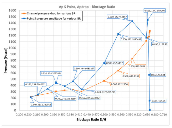 Figure 20 presents in the same diagram, the pressure amplitude at S with the increase of BR, along with the corresponding change in the channel average pressure drop. The comparative view of these two curves, namely, that of the pressure amplitude (for which a high value is desired) and that of the pressure drop (that a high value is unwanted) may be particularly useful to the designer of the device. Their comparison shows that, in the case under consideration, the increase in pressure amplitude due to the increase of the body width comes at the cost of about a similar pressure drop up to the value of BR = 0.42. Then, the two curves diverge, and they come close again at BR = 0.65 where both the amplitude and pressure drop are maximized. From a designer’s point of view and provided that these results would be validated by experiments, the value of BR = 0.60 seems to provide a significant increase in amplitude at the expense of a moderate pressure drop.
