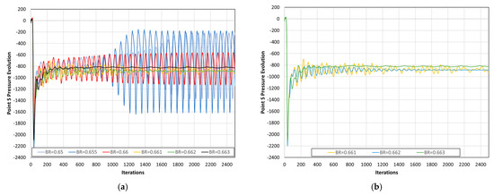 For the sake of completeness, Figure 22 demonstrates the predicted pressure signal at the center S of the diaphragm for various values of BR. In particular, the plots in Figure 22a refer to the values of BR = 0.65, 0.655, 0.660, 0.661, 0.662, 0.663, while those in Figure 22b refer to BR = 0.661, 0.662, 0.663. As it becomes evident from these plots, the value of BR = 0.662 is the first one for which the pressure essentially stops fluctuating.