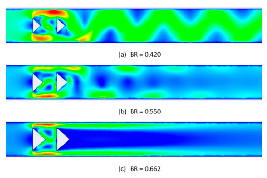 Figure 23 demonstrates iso-surfaces of instant velocity at a time 25 ms after the beginning of the flow solution for some BR values. Vortex shedding seems to be suppressed for BR = 0.662.