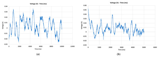 In parallel with the present work relying on simulations, a corresponding experimental work was conducted in the Department of Naval Architecture of the University of West Attica where the present authors belong. This concerns the fabrication of the device under consideration and the relevant measurements of the produced voltage by the piezoelectric element [26]; in that work, vortex shedding appears in the form of fluctuations in the measured voltage signal. In an effort to have an initial hint on what is the actual behavior of the flow in a case with BR > 0.42, the present authors addressed their question to the group of experimentalists. They asked them to conduct an indicative experiment with Vin = 20.7 m/s and BR = 0.55 in order to check if their measurements are compatible with the occurrence of vortex shedding in such a case. This value of BR is well beyond BR = 0.42, i.e., in a region where the present numerical results clearly predict vortex shedding, while in [7], suppression of vortex shedding has been noticed from the value of BR = 0.42. The desired experiment was performed twice using two piezoelectric membranes of different type, one at a time; with both membranes, it was verified that the measured voltage signal corresponded to a flow exhibiting vortex shedding [27]. For the sake of demonstration, Figure 25a,b depicts the measured voltage in the case with 2 bluff bodies for BR = 0.27 and BR = 0.55, respectively [27]. As can be seen, both cases exhibit similar behavior, that of a flow with vortex shedding. This fact is considered to be positive information for the results of the present study. (Obviously, the joint work that just started with the group of experimentalists must and will definitely be continued).