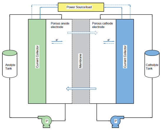 Research on electrochemical energy storage systems has been steadily growing since the flow battery concept evolved approximately four decades ago, and it is a promising agent for medium to large kilowatt-scale energy storage applications [,,]. Redox flow battery (RFB) technology is well established and is gaining traction due to its suitable integration to achieve efficiency, scalability, rapid sensitivity, longer life cycle, less maintenance, low cost, flexibility in energy and power capacity, the least impact on environment, and as one of the many electrochemical energy storage (ESS) methods, particularly to store renewable energy. RFBs are the best alternative to Li-ion stationary systems and have been authenticated and standardized by the International Electrochemical Commission as grid storage systems [,].
