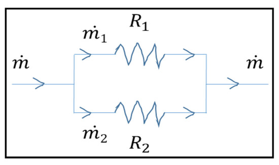 A hydraulic circuit model concept was developed corresponding to the flow field CAD model, to better analyze the electrolyte flow characteristics and resistance offered, as shown in Figure 4. Here, m represents the electrolyte mass flow rate; m1 and m2 are split mass flow, i.e., correlating to vertical and horizontal channels of the model, respectively; and R1 and R2 are resistance values corresponding to the vertical and horizontal halves of the model, respectively. Henceforth, the analysis considered the mass flow to be equivalent to the current flow, and the resistance was equivalent to flow deceleration due to skin friction and bend losses in the passage.