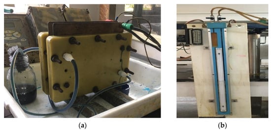 The fabricated setup consisting of end plates on either side connected to electrolyte flow pipes on the top left and bottom right corners, representing entry and exit passages for electrolyte flow to separate analytic and catalytic tanks, respectively, is shown in Figure 6a. The pressure gradient across the active cell area was able to be measured using a U-tube manometer, as shown in Figure 6b. The two separate electrolyte tanks on either side were filled to a volume of 250 mL. The prepared solution contained iron species Fe2+/Fe3+ and Fe2+/Fe, acting as positive and negative electrolytes, respectively, as stated in Equations (1) and (2).
