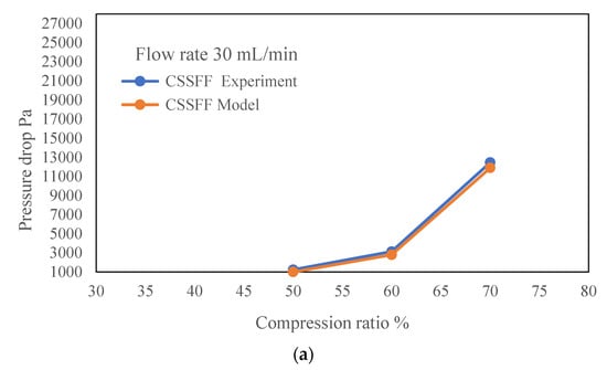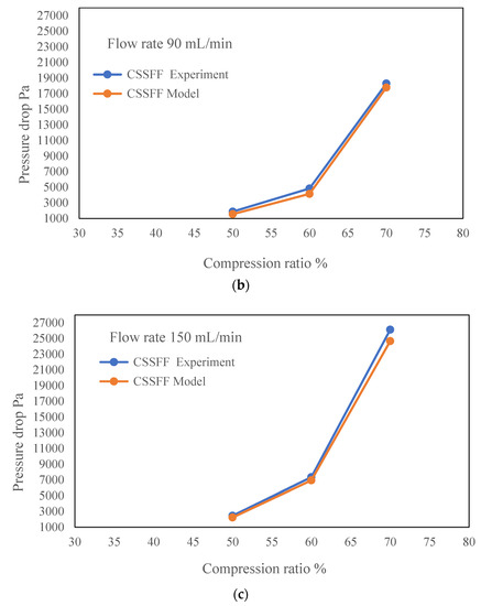 In Figure 12, the plotted line graphs represent the variation in pressure drop over an active cell area subjected to different CRs for varying flow rates. Figure 12a–c indicate that the pressure drop varied linearly for 50%, 60%, and 70% CRs, whereas there was a rapid increase in the pressure drop value at 70% CR for all the flow rates. The experimental pressure drop value reached a maximum of 26,130 Pa for the highest flow rate of 150 mL/min. The results demonstrate that linear variation showed good agreement for both the experimental and CFD values, with maximum error approximating 5%.