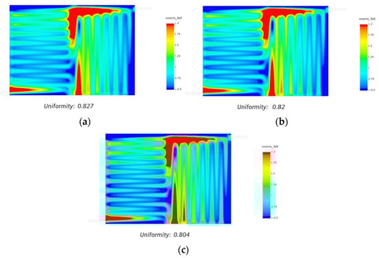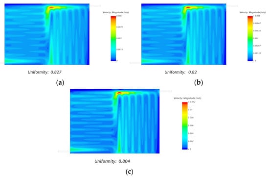 The predicted simulation of volumetric flow distribution for each case visualized similar patterns to those depicted in Figure 17a–c, which show maximum volumetric flow magnitudes at the topmost portion of the mid-cell region and the bottom portion along the same line downward in the space between the vertical and horizontal channels, as well as at the channel exit region. These regions yielded the highest electrolyte concentration; however, the values shown in Table 5 suggest that the uniform volumetric flow distribution across an active cell area is a function of the compression ratio.
