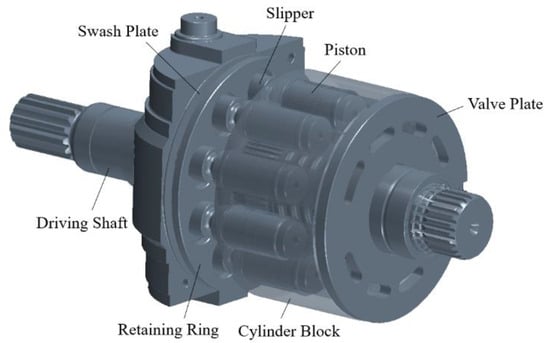 Within the wide range of positive-displacement machines commonly used in industrial and mobile applications, piston pumps and motors are recognized worldwide as the most sophisticated ones. The high number of internal components along with the advanced working principle require fine mechanical couplings and a precise phasing of the moving parts, proves necessary to ensure the proper machine’s operation. Nowadays, swash-plate-type axial piston pumps represent the most frequent choice for many users due to the extremely consolidated technology, which yields very high efficiencies at critical operating pressures, up to 400 bar. On the other hand, very fine machining tolerances and surface roughness are needed to reach the best possible pump performance. At the same time, the huge number of components leads to a high cost and weight compared to other positive-displacement machines, which still represent the main demerits for such architecture. The layout of a commercial swash-plate axial piston pump is presented in Figure 1.