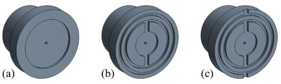 - Grooved slipper: one or more circular grooves are obtained on the running surface of the slipper. This device brings much more stability to the slipper as it periodically switches from a high-tilt position to a nearly flat one over each revolution of the pump. In this case, the leakage flow is always increased with respect to the single-land configuration, while the lift force may increase or decrease depending on the groove position central radius according to [18];