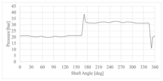 The proposed numerical methodology was tested at a specific pump-operating condition extracted from a real closed-circuit application in off-highway vehicles. A schematic representation of the simulated working point is reported in Table 2. The instantaneous pressure signal within the slipper central pocket was derived by combining the results of a previously validated 0D–1D model of the entire pump with the dynamic CFD analysis presented in [13]. The pressure data were sampled every 0.06 degrees of shaft rotation, and they were further included in the CFD model through imported tables and user-defined field functions, thus obtaining the inlet pressure curve displayed in Figure 5. In parallel, the drain pressure was set at the outer region by means of constant pressure outlets.