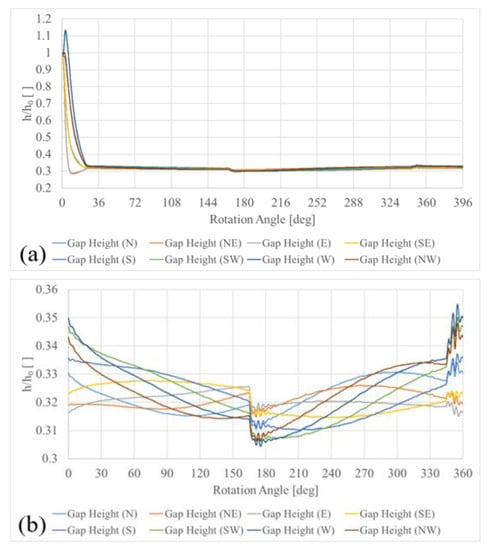 In Figure 9, eight different colors are used to outline the distance of each probe from the fixed swash-plate surface over a complete shaft revolution, therefore providing an effective description of the instantaneous slipper tilting under actual pump operations. The variation in the normalized clearance height during the first cycle of the pump is shown in Figure 9a. Starting from the nominal distance h0, the slipper progressively moved towards the swash plate after reaching a dynamic equilibrium after a 25-degree initial transient. In Figure 9b, the same plot outlines the evolution of the slipper–swash plate distance over the second revolution of the driving shaft.