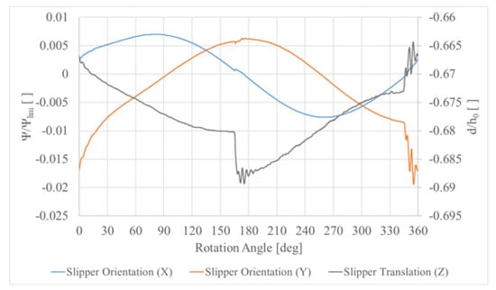 From now on, the proposed results only refer to the second revolution of the pump, thus excluding the initial spikes produced by the necessary numerical stabilization. In Figure 11, the separate contributions of the permitted rigid motions on the final position of the slipper are displayed in the normalized form. In detail, Ψlim represents the maximum tilt angle under nominal conditions, i.e., the angle Ψ, which produces slipper–swash plate contact for a central distance h0 between parts. A sinusoidal trend was observed in the rotations about both the X-axis and the Y-axis, while a mainly linear characteristic interspersed with abrupt variations at the transition intervals was extracted for the slipper translation along the Z-axis. In absolute terms, the variable distance between the slipper and the swash plate is primarily influenced by the slipper axial displacement with a secondary effect produced by the tilting motions.