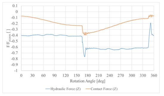 Fpi,i-sl,i represents the net piston force pressing the slipper towards the swash plate, while β symbolizes the swash-plate inclination angle. Moreover, the constraint force produced by the slippers retaining ring Frp-sl,i and the centrifugal force generated by slipper rotation Fsl,icen were added to the model in the form of external forces acting on the rigid body. On the other hand, the weight Fsl,ig, the force of inertia Fsl,iI, the viscous friction force Fsl,ivisc, and the contact force Fsw-sl,i produced by the slipper–swash plate collision were all included in the results of the simulation. In particular, the weight contribution was computed from the gravity acceleration included in the continuum properties along with the peculiar mass of the slipper. The lumped parameters model of the full pump was exploited to derive the evolution of the external forces as a function of the slipper angular position φ. The resulting dataset was imported in the CFD simulation through bi-dimensional file tables, while the corresponding plots were normalized with respect to the maximum force acting on the piston, Fpi,max, which are reported in Figure 7.