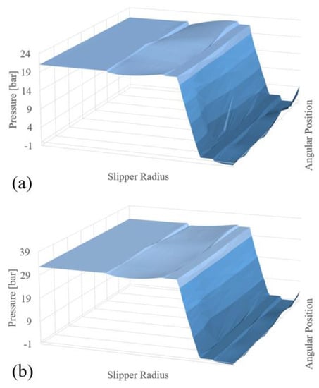 In conclusion, the pressure drop through the gap was studied. In Figure 15, a 3D plot is used to map the pressure distribution at the slipper–swash plate interface during both suction and supply intervals, and a non-uniform pressure drop was observed due to the variable clearance height caused by slipper tilting. However, this result hardly affected the overall lift force due to the reduced radial extension of the clearance, i.e., from the outer diameter of the internal groove to the inner diameter of the external groove, therefore proving the marginal contribution of the hydrodynamic effect in vented grooved slippers. On the other hand, the dominant contribution of the hydrostatic term generated by pressure at the slipper central pocket was highlighted. These considerations further suggest the negligible impact of the tilting dynamics to the hydraulic slipper balancing, therefore proving the validity of the ‘uniform pressure distribution’ approximation during the design stages of a vented grooved slipper.