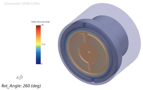 Moreover, the concept of intermittency associated with the gamma transition model was exploited to predict the onset of flow transition within the gap. In detail, the intermittency assumes a unit value when a fully turbulent flow is entered, while a fully laminar flow is predicted in which the intermittency becomes zero. In Figure 16, a section view of the clearance region at any slipper’s angular position displays a diffused null intermittency, thus remarking on the laminar nature of the flow. For the sake of completeness, a qualitative description of the pressure distribution within the three-dimensional fluid domain at the same instant of time is depicted in Figure 17.