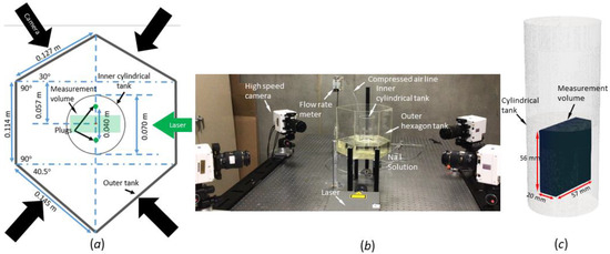In this experiment, a cylindrical container with an inner diameter of 70 mm is implemented to simulate and replicate the characteristics of a cylindrical ladle (To avoid NaI solution spill onto the high-speed cameras and Laser a tall cylindrical wall of 178 mm is implemented). However, due to the curved surface of the cylindrical container that would introduce significant particle image distortion from refraction, the conventional flow field measurement methods, such as Particle Image Velocimetry and Particle Tracking Velocimetry, cannot be directly implemented to measure the flow field. Therefore, this study adopted the refractive index matching method to counteract the effects of image distortion due to refraction. Additionally, to capture and film the particle images from four different perspectives, a four-camera particle tracking velocimetry system was strategically configured on a larger hexagon tank with six flat walls meticulously designed to accommodate the angle of imagining. This larger hexagon tank was designed to allow the cameras to film the flow inside the cylindrical tank, which was positioned at the center of the larger hexagon tank, with the cameras filming perpendicular to the flat walls. Both tanks were fabricated from plexi-glass. To ensure optimal refractive index matching and thereby minimize image distortion, a Sodium Iodide solution was prepared and used to fill the tanks to a height of 84 mm. Importantly, the refractive index of the Sodium Iodide solution closely aligns with that of plexi-glass, ensuring minimum light refraction as the scatted light from the seeding particles traverses the curved plexiglass walls and the solution, eliminating particle image distortion when the Particle Tracking Velocimetry is employed. During the experiment, the compressed gas is introduced to the cylindrical tank through two 4.7 mm circular plugs at the bottom of the tank. The plugs sat on the centerline of tank with a distance of 40 mm. Two mechanical flow meters with an accuracy of 0.02 L per minute (Brooke Instrument, Hatfield, UK) were utilized to measure and monitor the flow rate of the compressed gas during the experiments.