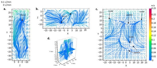 With the gas injection flow rate elevated from 0.1 to 0.2 L per minute, the previously symmetrical, organized, and predominantly vertical streamlines evolve into irregular and predominantly horizontal flow pattern. While the effect is less pronounced, another transition occurs as the flow rate is further increased to 0.3 L per minute. This shift is evident in the changing orientations of the streamlines, which regain a more vertical alignment. Upon examination of the mean velocity streamlines at various planes, additional confirmation of the observed trends is confirmed in Figure 5 and Figure 6. Figure 5 solidifies the depiction of a highly organized and structured flow pattern at the low double gas injection rate of 0.1 L per minute. Intriguingly, it becomes apparent that despite gas injection aiming to introduce upward momentum, downward flow dominates the measured flow field at the low gas injection rate of 0.1 L per minute. A focused analysis of the streamlines and mean velocity across stream-slices reveals the concentration of low velocity around the focal point on frontal plane (Figure 5c). The presence of this low velocity spot in the mean velocity field is unwanted, as it leads to fluid accumulation, hindering the efficient fluid mixing process. Raising the gas flow rate to 0.3 L per minute, the dominant flow momentum alters from downward to upward while exhibiting reduced outward curvature (Figure 6). Furthermore, high velocity concentrations become more prevalent across all planes. These trends suggest that higher gas flow rates could be advantageous in attaining the desired flow uniformity and mitigating the accumulation of stagnant fluid.