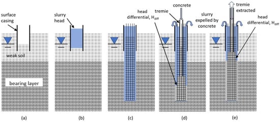 After the excavation is completed to the required depth (filled with slurry) and steel reinforcement has been placed, concreting is performed from the bottom up via a tremie or rigid pump line extending to the bottom of the excavation. As sketched in Figure 1d,e, concrete displaces the drilling fluid and fills the excavation. While the concreting is taking place the tremie pipe can be withdrawn in stages or might be left near the bottom for the entire concrete pour.