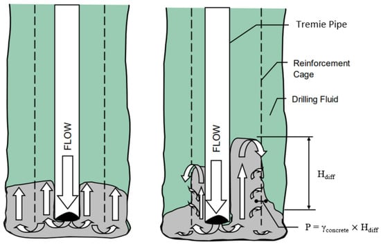Schematic of idealized concrete flow (left) and actual concrete flows (right) displacing the drilling slurry [3]. The concrete (with specific weight γconcrete) is sketched in gray and the slurry in green. The real concrete flow on the right develops a head differential, Hdiff, not observed in the idealized flow on the left.