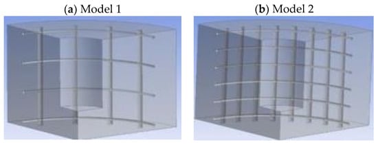 Figure 8 shows the distribution of concrete (red) and slurry (blue) obtained from the model 4 simulation with NC at flow time = 35 s. A mattressing pattern of creases develops in the concrete cover region as the NC flows around the rebars and ties. Similar patterns were observed in the field [2,3,7] and lab [4] (see Figure 2c).