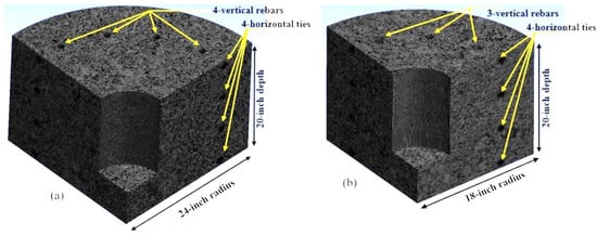 (a) Model 1: 48-inch diameter shaft model with 4 vertical rebars and 4 horizontal ties. (b) Model 2: 48-inch diameter shaft with 8 vertical rebars and 6 horizontal ties. (c) Model 3: 36-inch diameter shaft with 3 vertical rebars and 4 horizontal ties. (d) Model 4: 36-inch diameter shaft with 5 vertical rebars and 6 horizontal ties. All models are 20 inches in height or depth.