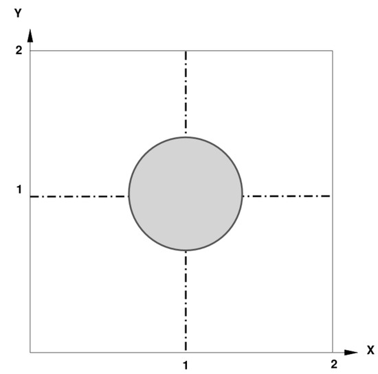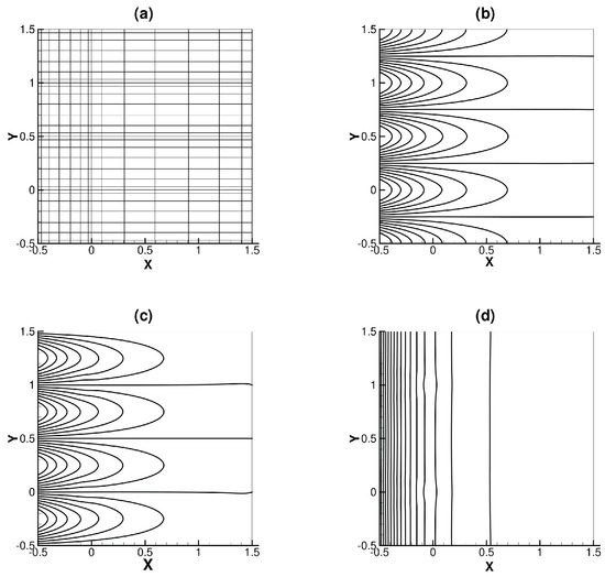 The Kovasznay fluid flow [53] is an exact solution of the Navier–Stokes (NS) equations, which somehow depicts the flow behind a two-dimensional grid. It is commonly used to validate numerical codes in solving two-dimensional NS equations in the low Mach regime (incompressible flow). Let the density of the Newtonian fluid be denoted by and viscosity by . Let the spatial computational domain be denoted by . The problem is described as a temporal evolution with the time . Let N denote the space dimension over which the problem is described. We denote the boundary as for the computational domain of . The Navier–Stokes equations are specified below: