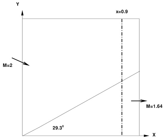 The problem involves the solution of a two-dimensional flow entering a flat domain at an angle of with respect to the horizontal plane. The inflow Mach number is , over a flat plate. The reason for the formation of the shock in this problem is the incoming high speed flow inclined at a predetermined angle, which results in the formation of a shock wave from the bottom of the incident flat plate. This flow results in a shock that emanates at an angle of from the leading edge of the plate. Analytic solutions exist for the post-shock region based on the Rankine–Hugoniot relations, and the following describes the inflow and the jump conditions in the post-shock region: