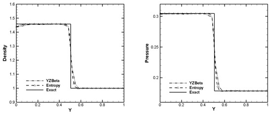 Figure 7 (right) compares the pressure profile at the vertical cross section at the x-coordinate location of . For both shock-capturing parameters, the results are in good agreement with the exact solution to this problem. The entropy-based definition of the shock parameter provided a slightly sharper resolution of the shock; however, in later experiments, it was realized that parameter performed better.