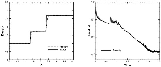 Sod’s shock problem represents a classical problem of compressible flow computations for evaluating the accuracy of a numerical scheme, since there is an analytical solution available. The problem involves a differentially pressurized chamber with a high-density and high-pressure region and a lower-density and low-pressure region separated initially by a diaphragm. At the time instant, , the diaphragm is allowed to break, and the problem evolves in space–time. The driving force for this problem is the initial separation of the high density and high pressure region that interacts with the low-pressure side. Shock propagation along the X axis is the problem we wish to examine.