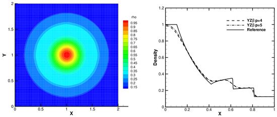 The implosion of the low-density region with the high-pressure region is evident in Figure 17. We utilized the (Equation (28)) parameter since this definition was found to be more robust in the context of spectral computations. The results are in agreement with the results presented in Nazarov [55].