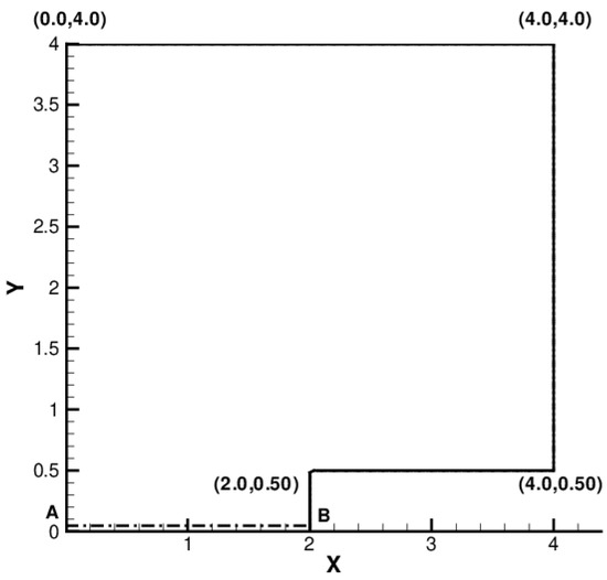 where is the fluid density, is the velocity vector, e is the total energy per unit mass, p is pressure, and . Moreover, is the domain in and T is a positive real number. We denote the spatial coordinates, respectively, and , where the superimposed bar denotes set closure and denotes the boundary of the domain . We consider an ideal gas for analysis. The equations are the first-order hyperbolic Euler equations without consideration of any viscous effects. Details regarding the mathematical model of the Euler Equations can be found in [32].