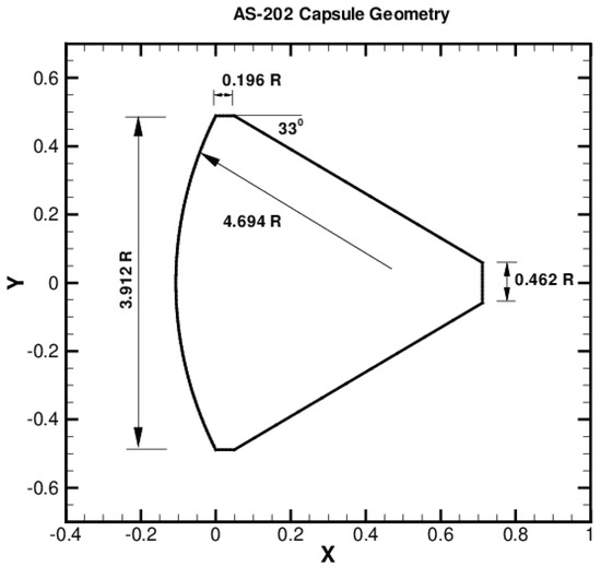 Hypersonic flows exhibit complex multi-physics phenomena and very high-temperature increases across the shock. This temperature increase can be described by Rankine–Hugoniot conditions or the normal shock relations as the first estimates. We consider atmospheric reentry at Mach number and . Let us consider an inviscid solution for the external flow analysis of the AS 202 capsule. The capsule was considered to have the normal component of the velocity prescribed to zero. Figure 18 presents the outer mold line for the AS-202 capsule. The problem was discretized into both coarse and fine meshes. The coarse mesh consisted of a macro mesh with a total of 4920 elements with a total of 79,378 nodes in the problem. A finer mesh considered a total of 8000 elements and a total of 128,802 nodes. Both meshes considered a polynomial expansion of 4 in each element. The problem specification required prescribing the inflow velocity at the inlet and the top and bottom of the computational mesh, as shown in Figure 19.