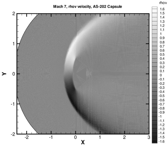 Figure 22 presents the u component of the velocity for the velocity profile along the stagnation line. There is excellent agreement between the density and the velocity profiles along the stagnation line between the coarse and fine meshes providing a numerical validation process. We utilized the parameter for analysis of the problem considered. After the above validation exercise, we examine the whole flight envelope for the AS-202 capsule on the finer mesh.