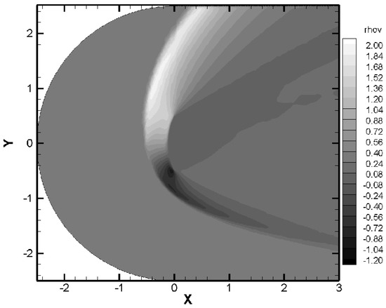 We consider as a validation exercise the external flow field around the capsule at Mach . A contour plot of the component of the velocity is presented in Figure 20 on the finer mesh. A comparison of the density has been presented in Figure 21 for both fine and coarse meshes along the stagnation line.