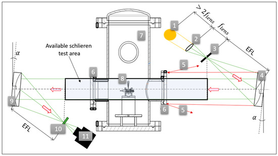 The Z-type color Schlieren setup: 1—Ls-W1 light source; 2—biconvex lens; 3—square diaphragm; 4— parabolic mirror; 5—(red) rays reflected back by the vacuum chamber’s outer casing; 6—circular glass windows; 7—vacuum chamber assembly; 8—investigated exhaust jet; 9—second parabolic mirror; 10—color filter calibration mechanism; 11—high-speed camera.