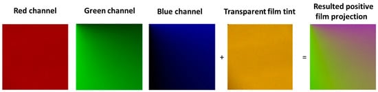 The photographic film is calibrated without removing the tint effect. The Phantom Veo 1310L CMOS camera produced by Vision Research Inc. (Wayne, NJ, USA) can record 24-bit depth images, which means it is capable of illustrating possible color combinations. The structure of the colored filter and its individual color channels as shown by Figure 2 with the film tint applied is as follows: the red channel’s values vary very little causing it to look rather constant without any variation, the green gradient intensifies from left to right, and the blue channel intensifies from the bottom to the top.