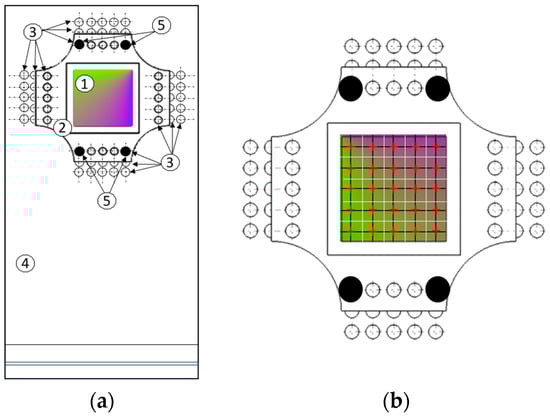 (a) Calibrating mechanism with 1—color-graded filter, 2—calibration plate with filter frame, 3—positioning rows of holes in the fixed plate for the displacement of the calibration plate, 4—fixed plate, 5—locking pins. (b) Color filter calibration grid, where the red crosses represent the center of the light source during calibration, the white rectangles represent its 25 calibration positions, and the dark circles represent the fixing pins which are designed to position the calibration plate onto the fixed plate.