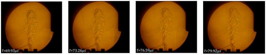Figure 5 presents the initial moments of the jet development. This sequence is presented here for two important reasons. The first one is to observe the influence of the vacuum chamber on the jet’s development, illustrating the velocity with which the pressure wave returns, which can be similar to the velocity of the jet returning into the main visualized area as background noise, and the second one is to underline that the black gradient pictured into the first frame containing the jet is caused by the system recording a ray deflection angle which surpasses the system’s capabilities.