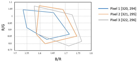 Calibration curves for three different pixels, represented by the R/G and B/R color ratios.