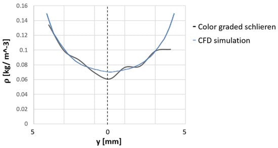 Density profiles along the A-line pictured in Figure 8, as obtained from the color-graded Schlieren analysis (black curve) and the CFD results (blue curve).