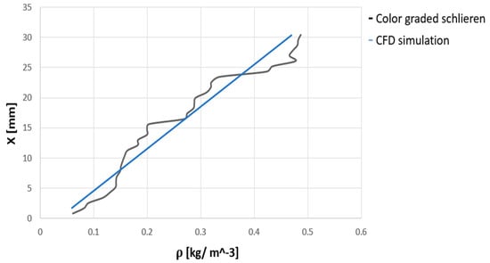 Density profiles on central axis density profile from origin to 31 mm on the x axis, pictured in Figure 8a, as obtained as obtained from the color-graded Schlieren analysis (black curve) and the CFD results (blue curve).