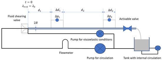 An alternative solution consists in using a pipe rheometer []. In a pipe viscosimeter, the pressure drop along a tube is measured at different flowrates, and the rheological behavior of the fluid is inferred from those measurements (see Figure 1). It is composed of a pump, a flowmeter, a measurement pipe section with a constant diameter and a differential pressure sensor across the measurement pipe section. The inlet of the pump is connected to a tank which contains the fluid that shall be measured. Typically, the tank has an internal circulation mechanism to avoid settling or gelling. The ports of the differential pressure sensor are sufficiently far away from the entrance and exit of the pipe section to ensure that the flow is fully developed at the measurement points. Here, the internal pipe radius is denoted by . The pressure differential, , is often measured over a long distance, , to increase the sensitivity of the measurement.
